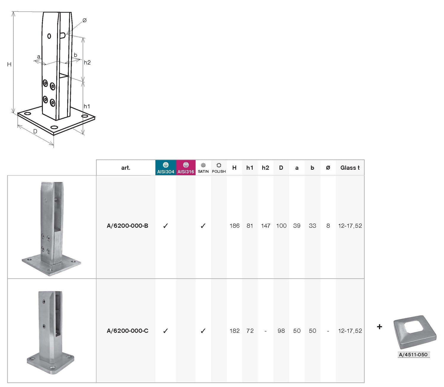 Material: Stainless steel AISI 304, Surface finish: Satined, Glass t: 12-17,52, Anchoring: Top, Glass hole: 15, G/h kN: 0,5