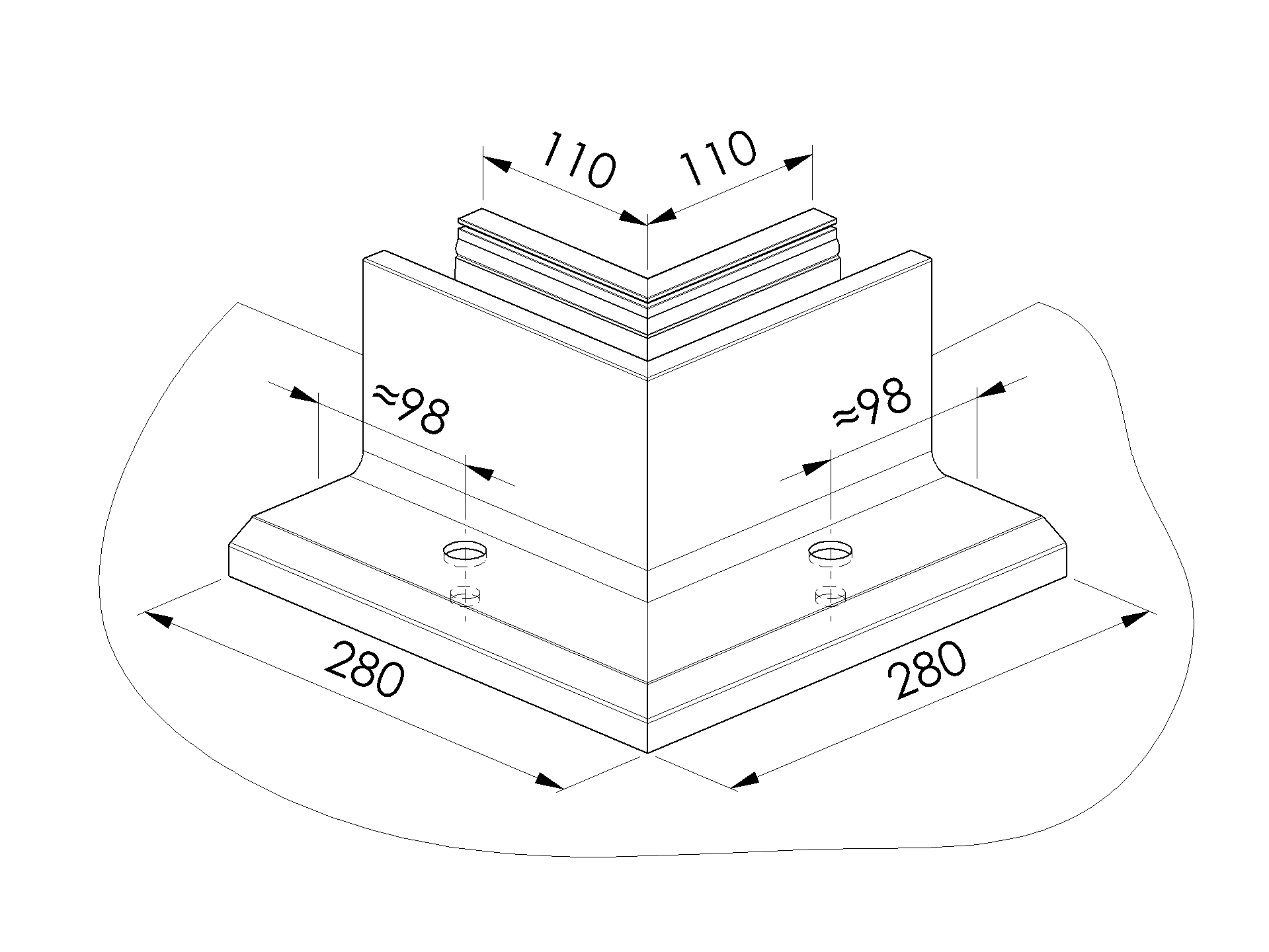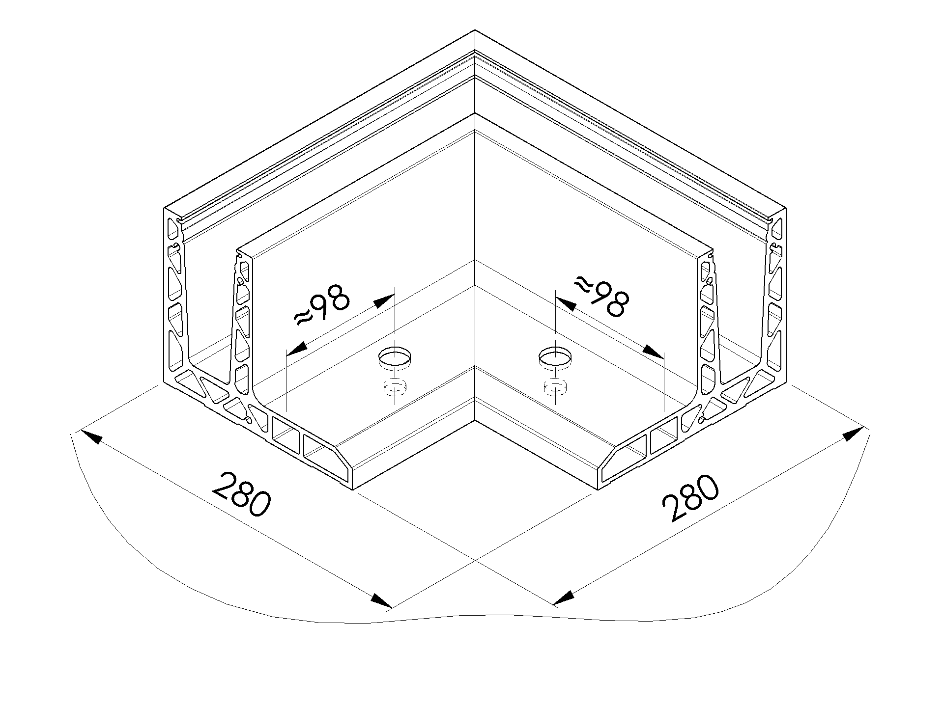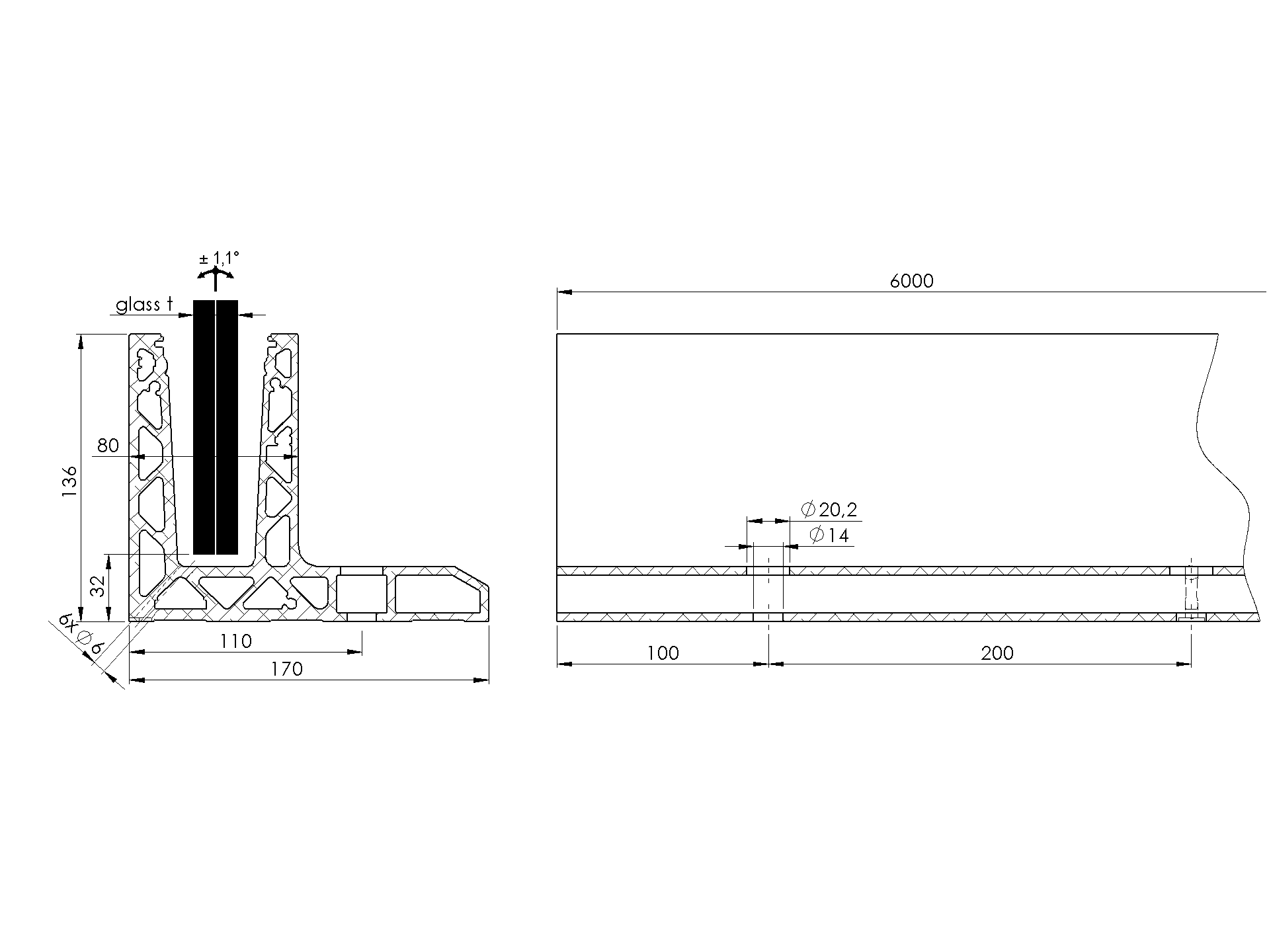Al. anchoring profile ELOX, top anchoring to the floor, adjustable glass angle. Supplied in lengths L2500mm (13 holes d14mm for anchoring). Supplied without seals. Surface finish ELOX - brushed.