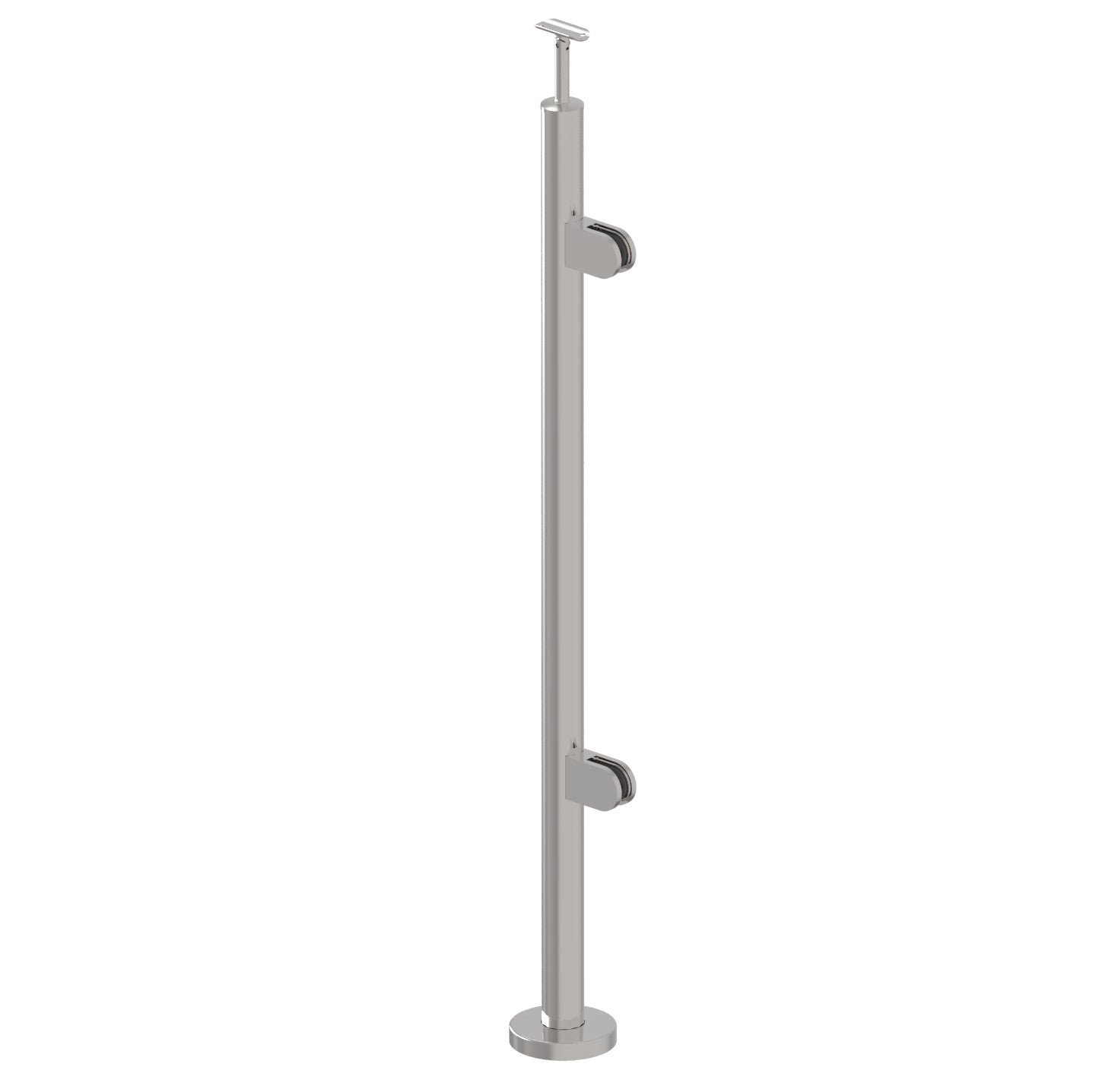 Rozsdamentes, felső rögzítésű, jobbos oszlop körszelvényből kapaszkodótartóval és üvegmegfogókkal, 1000 mm magas üvegkorlát kivitelezéséhez lépcsőre. Az oszlop nem tartalmaz rögzítéstechnikai eszközöket.