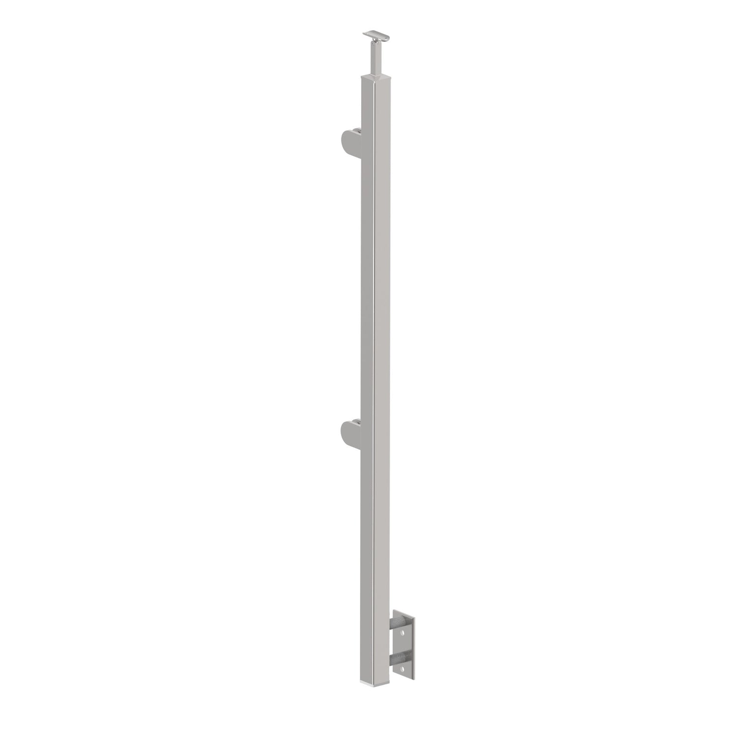 Rozsdamentes, oldalsó rögzítésű, szögletes, balos oszlop kapaszkodótartóval és üvegmegfogókkal, 1000 mm magas üvegkorlát kivitelezéséhez sík felületre (galéria/terasz). Az oszlop nem tartalmaz rögzítéstechnikai eszközöket.