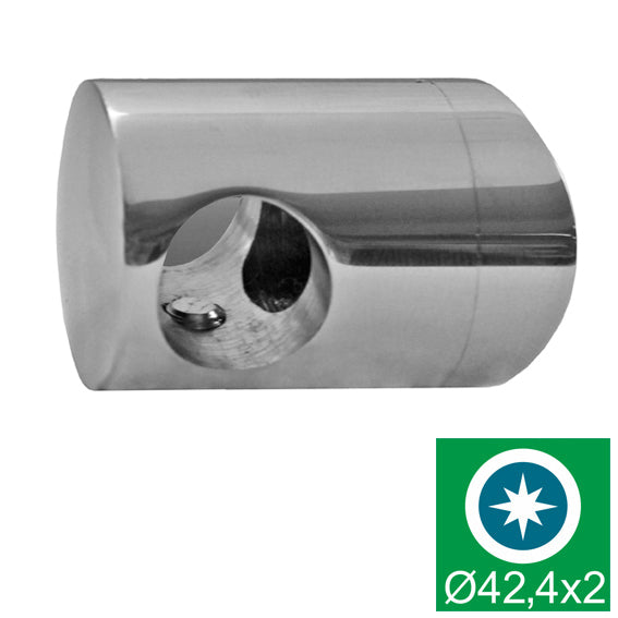 Rozsdamentes, polírozott, jobbos pálcatartó 42,4 mm átmérőjű körszelvény oszlopra, 12 mm átmérőjű pálcához, horizontális pálcás korlát kivitelezéséhez.