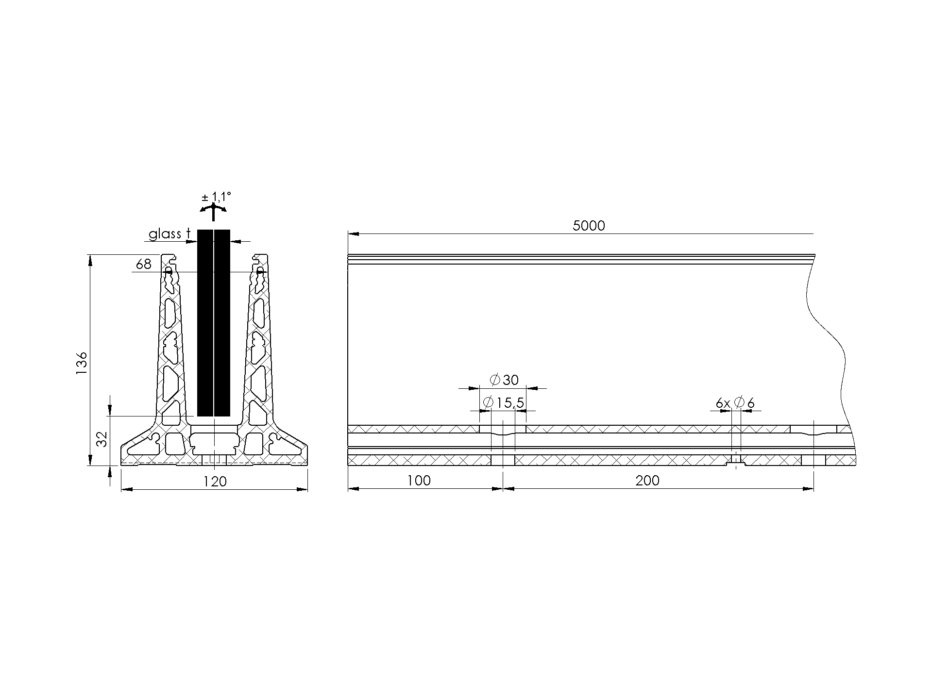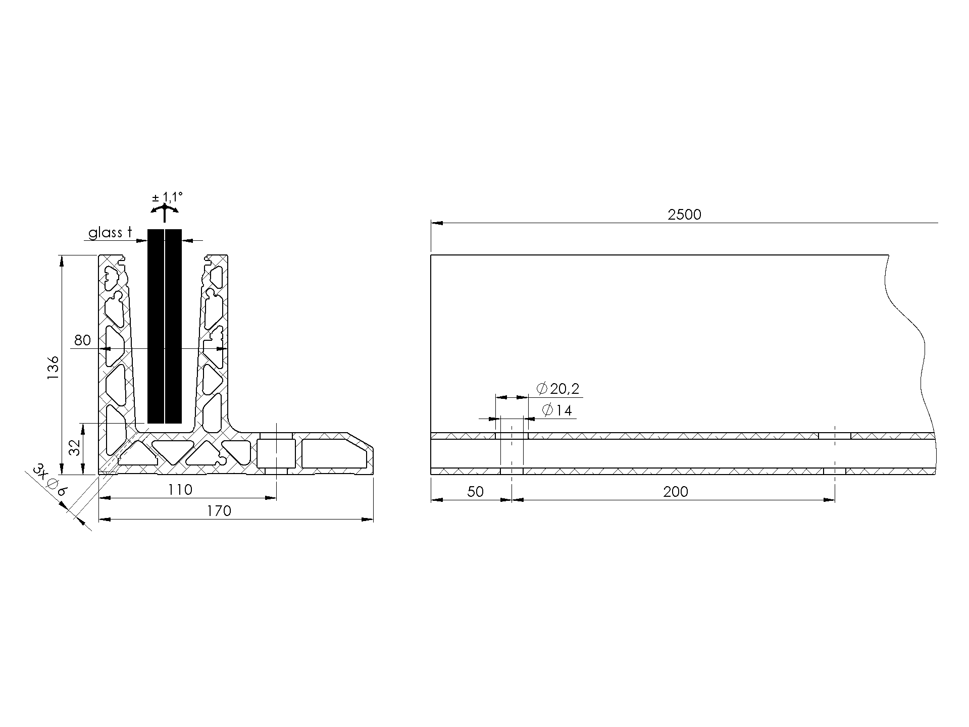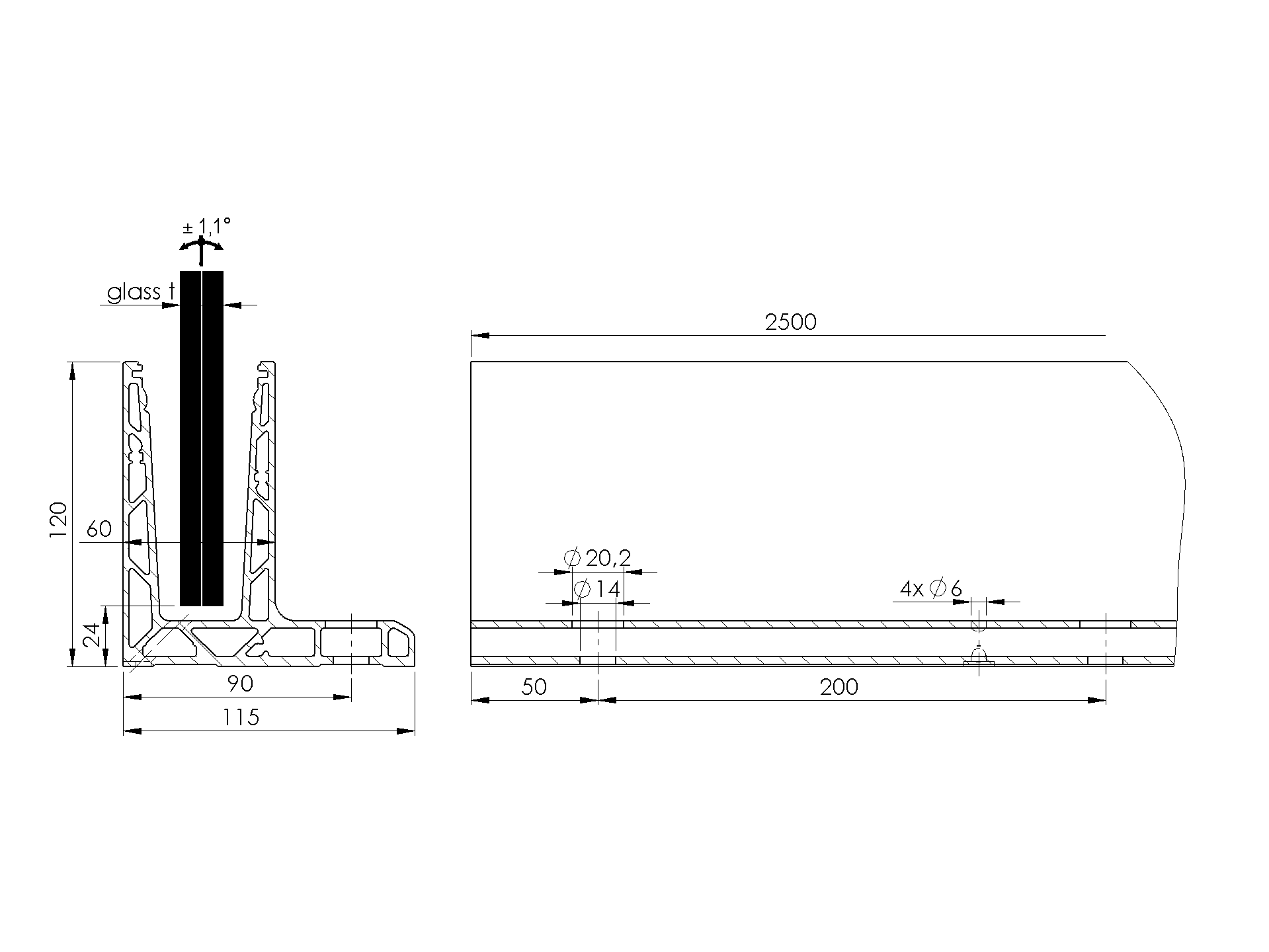 Oldalperemes alumínium profil üvegkorláthoz AL/0006-6000-S-E