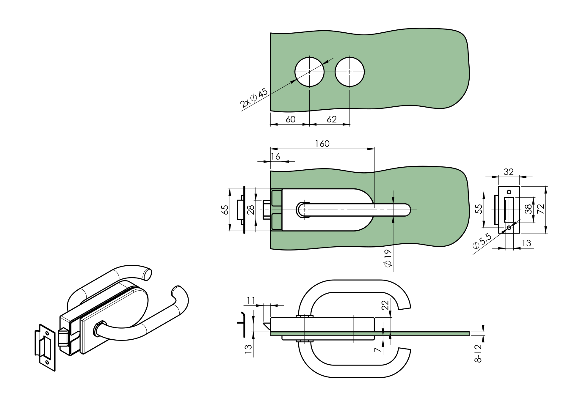 Rozsdamentes zárszerkezet üvegajtóhoz t 8,10,12mm BLACK GS-BLACK/D-201/S