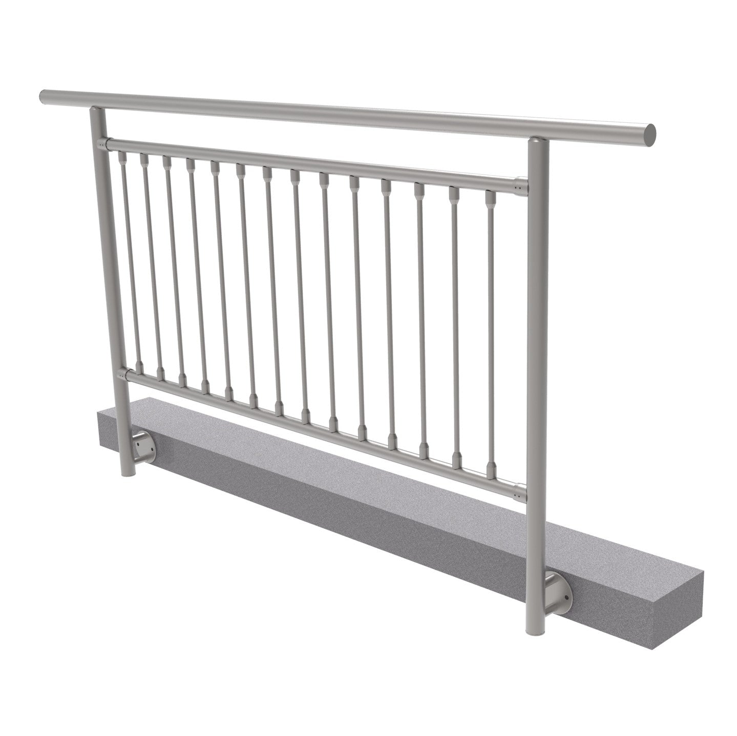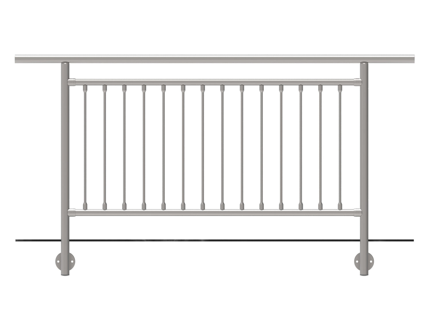 Oldalsó rögzítésű, vertikális pálcás korlát szett galériára, méretei: 2000x1000 mm. A szett standard méretben tartalmazza a szálanyagot, és szükség szerint méretre vágható a kivitelezés helyszínéhez alkalmazva. A kivitelezés alkalmával a kapaszkodó csövet furatolni kell, a végzárókat pedig fémragasztóval kell beragasztani. Rögzítéstechnikai eszközöket és szerszámokat a szett nem tartalmaz.